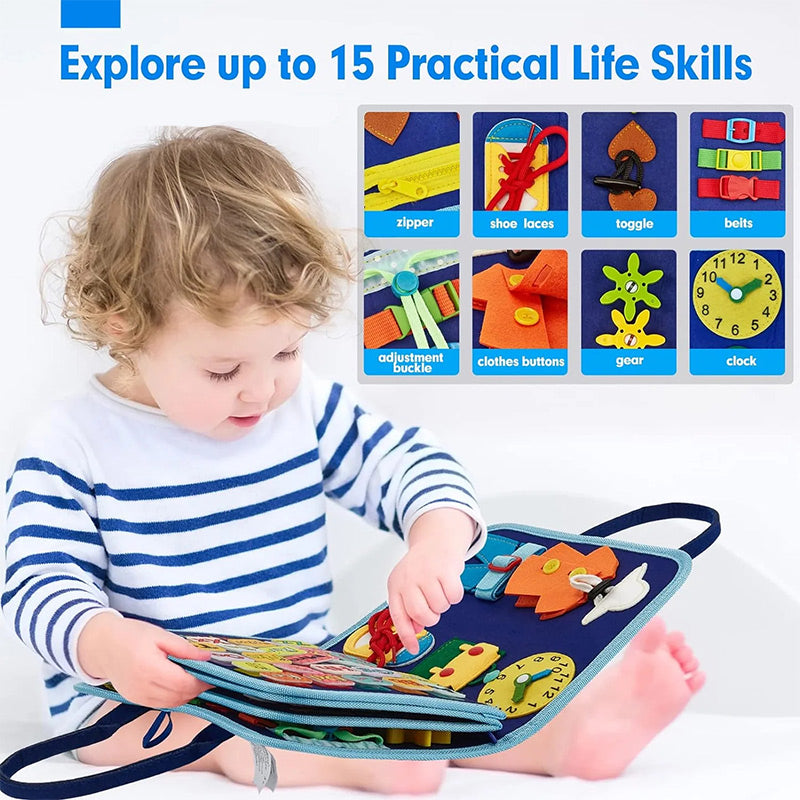 Har knappar, dragkedjor, spännen och fler interaktiva element! Främjar finmotorik, hand-öga-koordination och sensorisk utforskning – och förbereder småbarn för dagliga uppgifter. ✋
