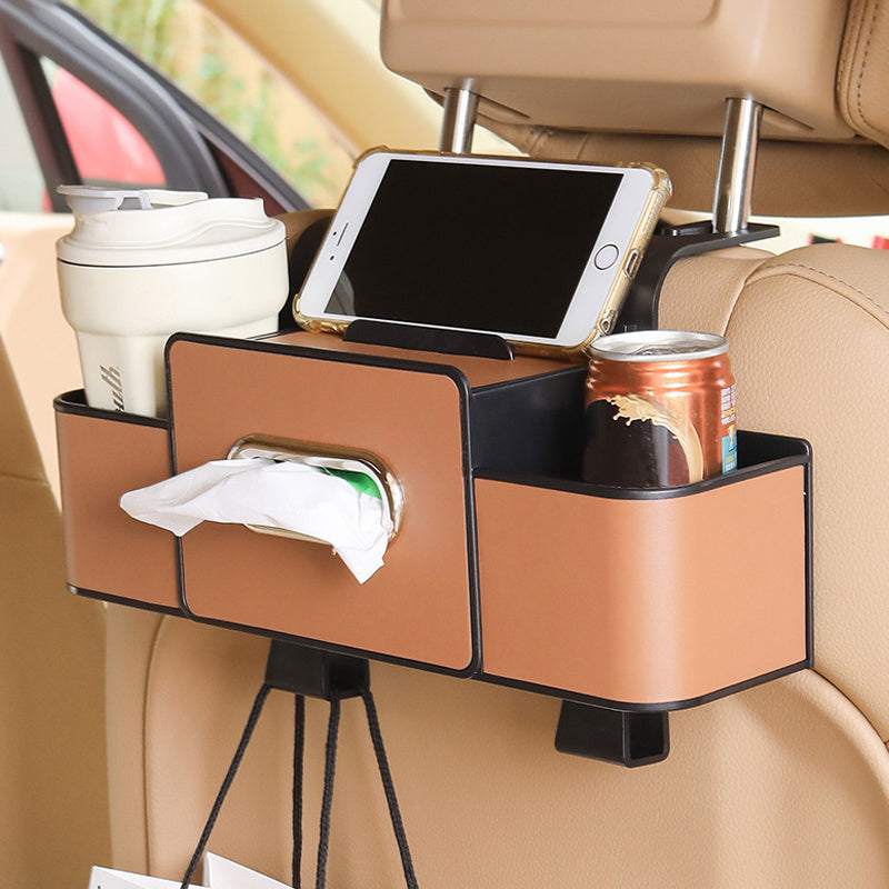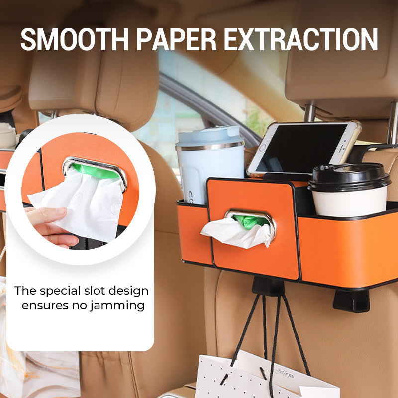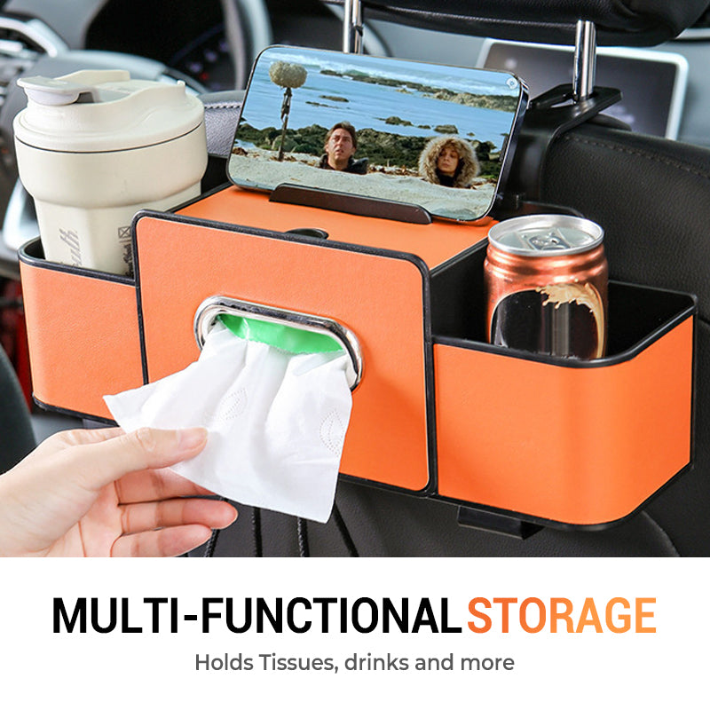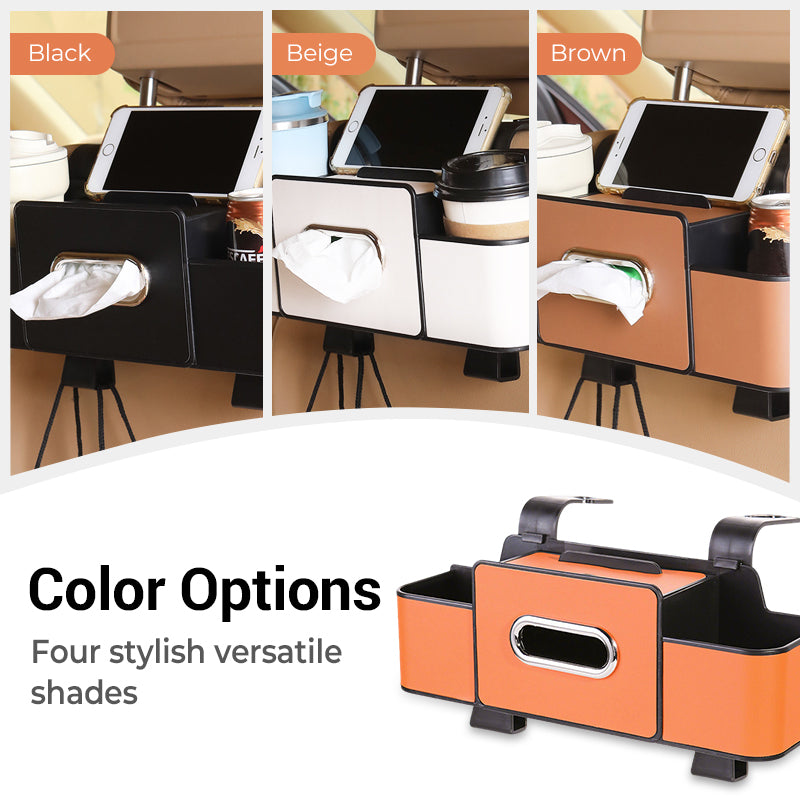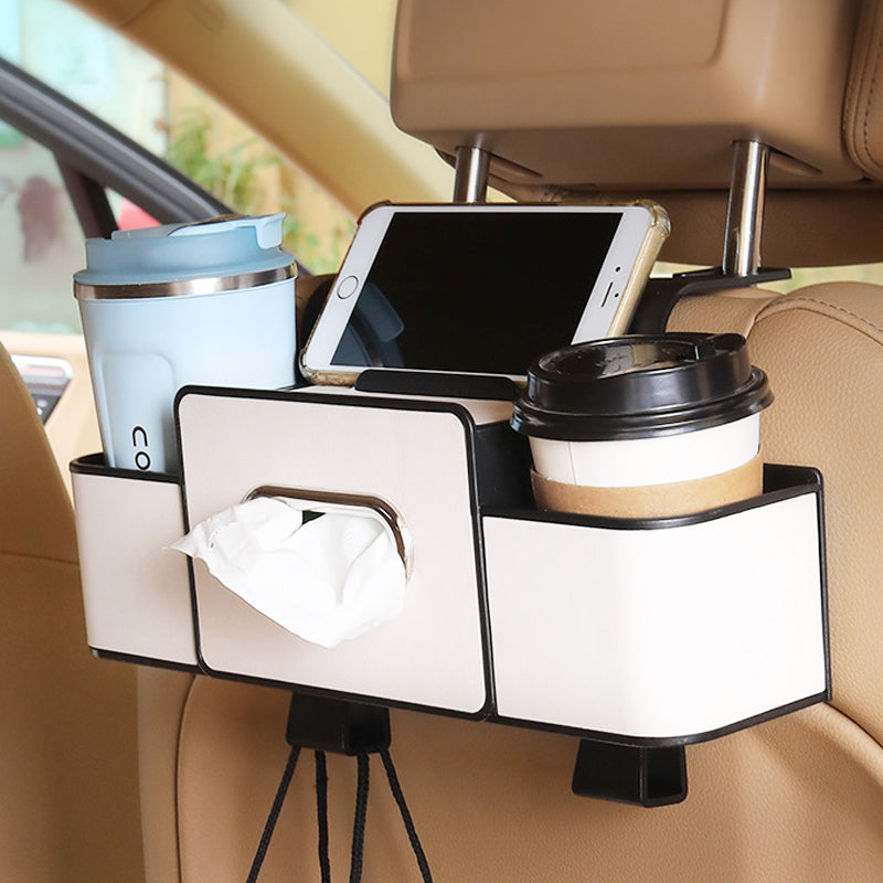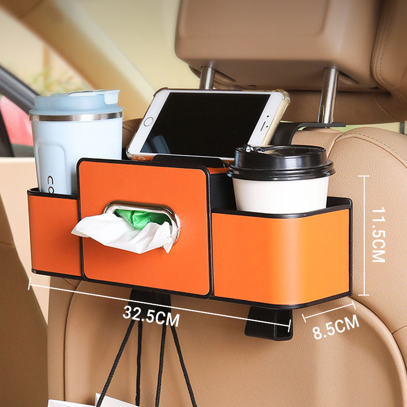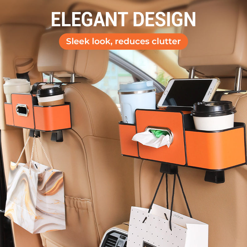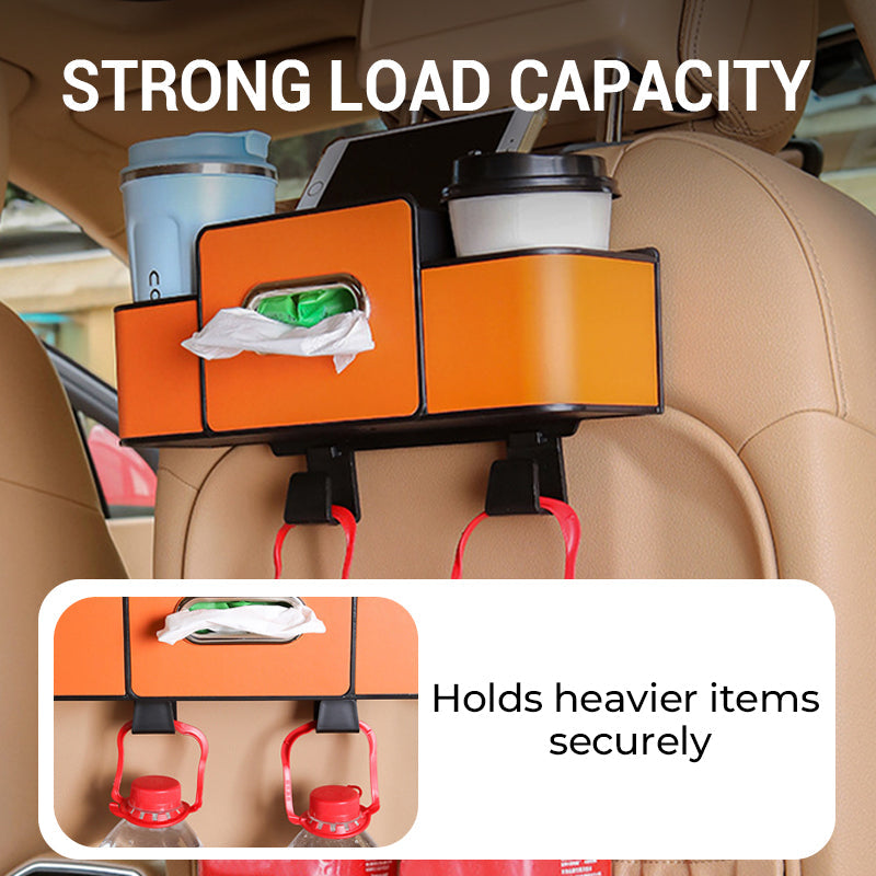 MULTIFUNKTIONELL FÖRVARINGSBOX: Utrustad med telefonhållare, fack för servetter, mugghållare och högkvalitativa krokar. Förvandlar enkelt bilens baksäte till ett snyggt och praktiskt utrymme.