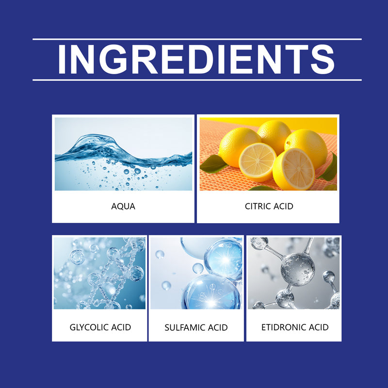 Hoofdingrediënten: Water, citroenzuur, amidosulfonzuur, glykolsuur, hydroxietylidendifosfonsuur